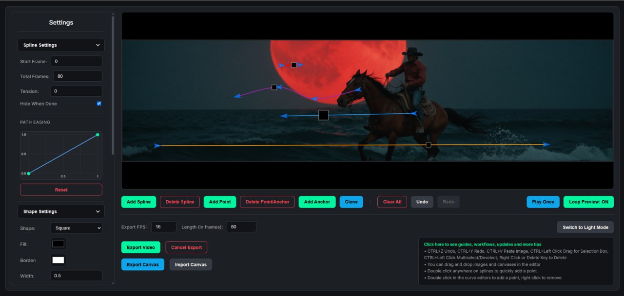 📁 软件简介:一款AI动画生成工具。可以导入背景图像,编辑样条曲线,并将最终结果导出为.webm视频文件。