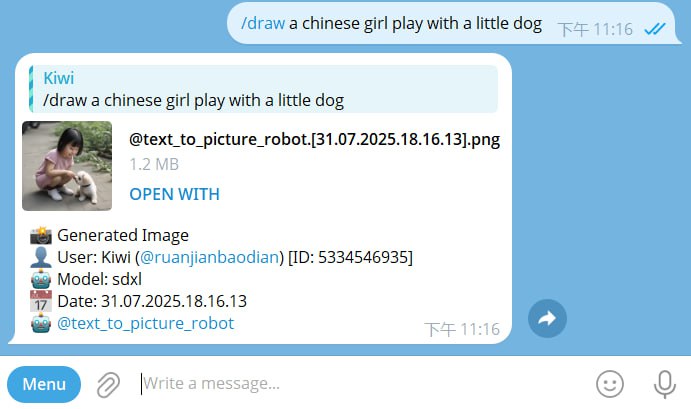 📁 机器人简介:一款AI图像生成工具,发送提示词给机器人即可生成AI图片。只不过机器人都是外语,需要一些英语水平才能使用。