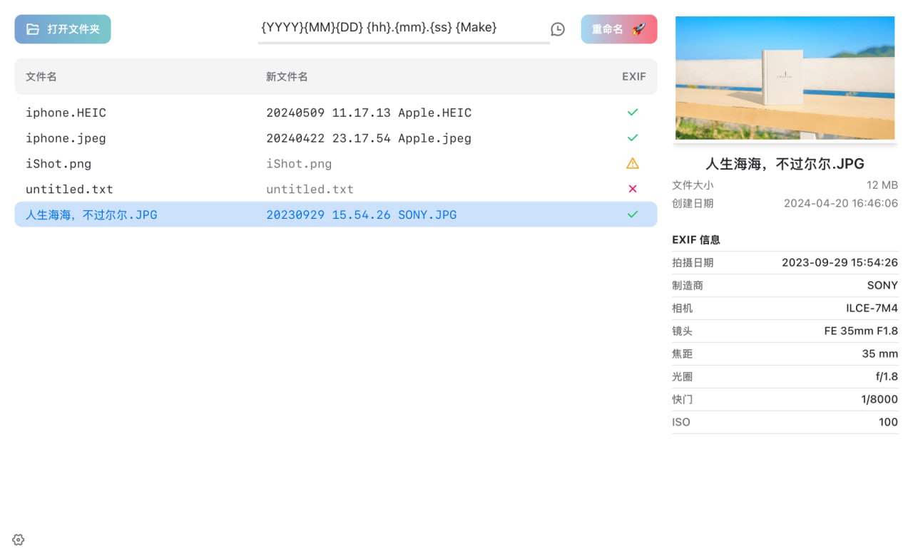 还具备处理EXIF数据的能力,能够自动生成序列号以避免命名冲突,并且即使文件缺少EXIF数据,软件也能使用创建时间进行命名