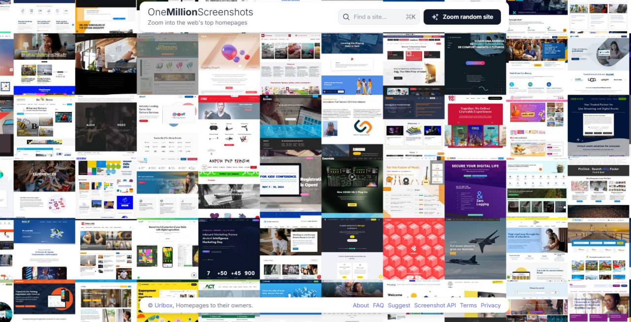 📁 网站简介:一个可以浏览和探索互联网上超过一百万个主页的截图的网站。可以通过缩放和点击的方式,像使用谷歌地图一样,深入查看各个网站的外观和布局。