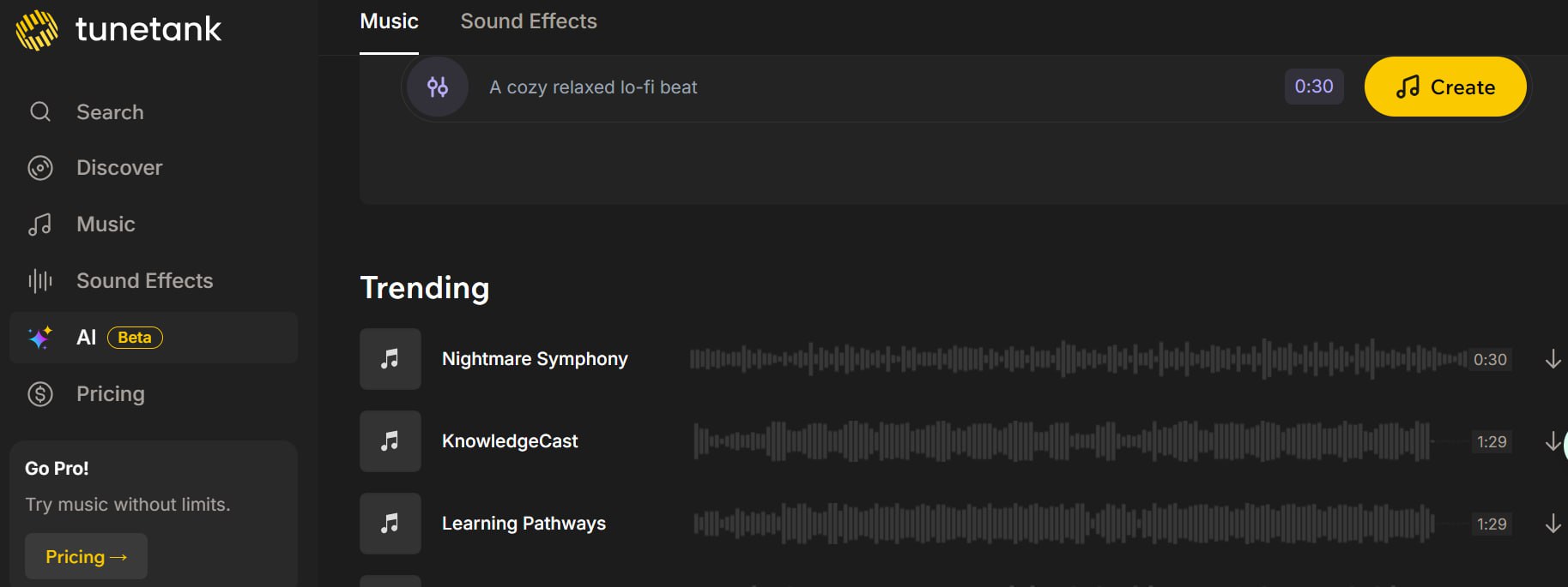 Tunetank 2024-08-17 🆔 网站名称:Tunetank ⭐ 网站功能:AI音乐生成 📁 网站简介:一个提供高质量免版权音乐的平台,可以在该平台上找到适用于各种创作需求的原创音乐。 还有AI音乐生成功能,生成的音乐可以商用。 🔗 网站链接:点击打开