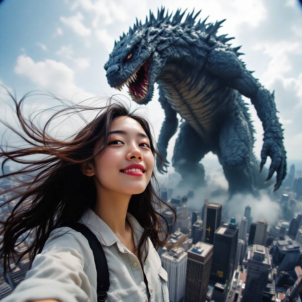Prompt ✏️: A Young Asian Woman, with hair billowing behind her, is captured candidly with a fisheye lens, taking a selfie with a monstrous kaiju towering over a city, using an Instagram Aesthetic and Kodak Ektar 100 film stock.
