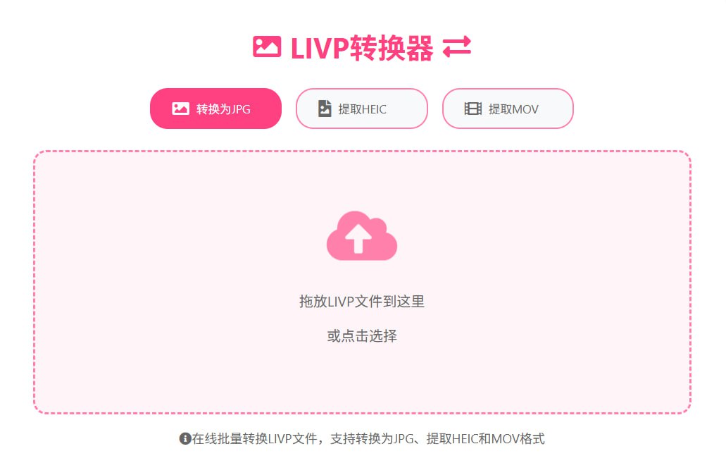 LIVP转换器 2025-04-16 🆔 网站名称:LIVP转换器 ⭐ 网站功能:图像格式转换 📁 网站简介:一个免费的将iPhone的实况照片(LIVP格式)转换为JPG格式的工具。可以通过简单的拖放操作,将LIVP文件上传到网站进行批量转换。 不仅支持将LIVP文件转换为JPG,还可以提取HEIC图片和MOV视频。 🔗 网站网址:点击打开