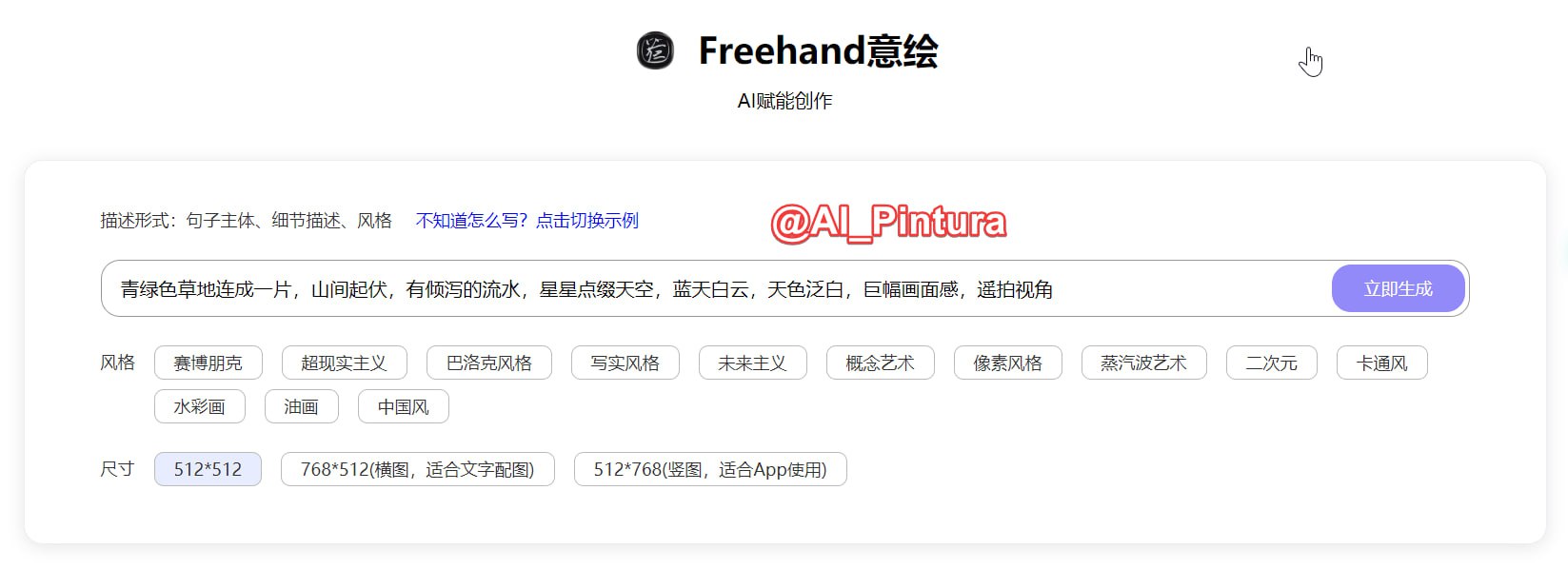 Freehand意绘 2023-07-19 🆔 网站名称:Freehand意绘 ⭐️ 网站功能:AI绘图 📁 网站简介:一款免费的AI绘图工具,支持中文,支持选择绘画的风格和尺寸大小,使用无需注册登录。 🌐 网站网址:[点击打开 ](https://freehands.cn/)