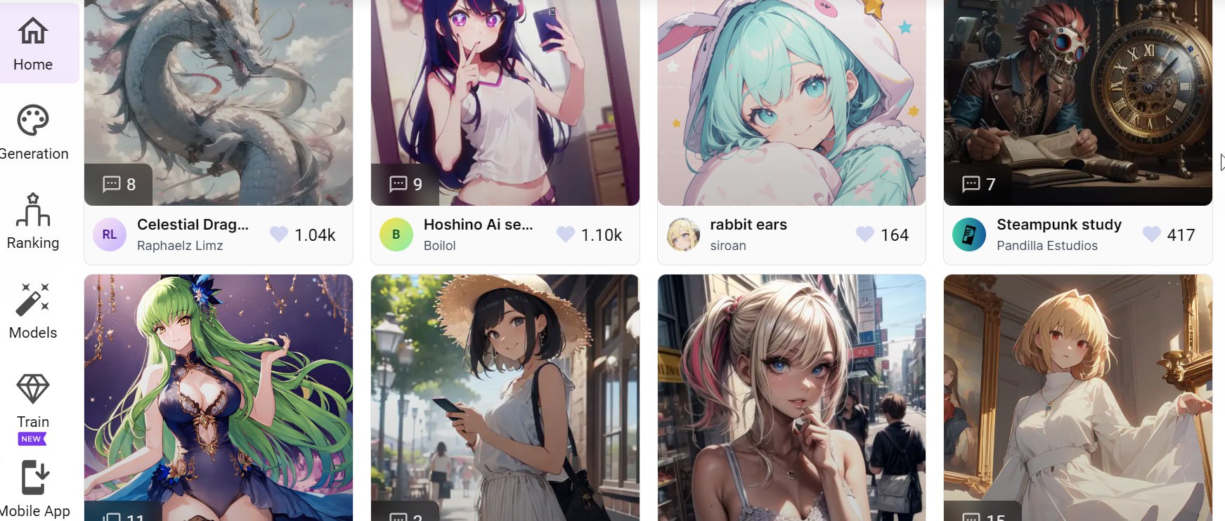 PixAI 2023-08-27 🆔 网站名称:PixAI ⭐️ 网站功能:AI生成动漫图 📁 网站简介:一款AI生成动漫图的工具。输入提示词即可生成动漫图。 网站有很多人生成并分享的动漫图。也可以训练自己的模型,只不过这个是收费功能。 🌐 网站网址:[点击打开 ](https://pixai.art/)