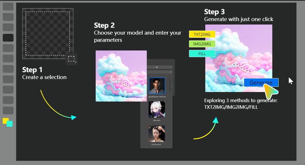 提供 TXT2IMG、IMG2IMG 和 INPAINTING 三种方法进行图像生成。提供正面和反面的提示输入以及个人笔记本编辑器。