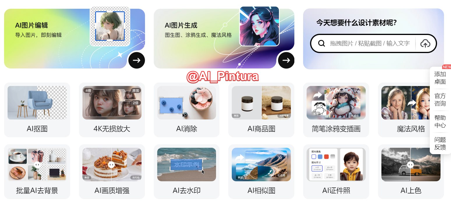 360智图 2024-03-09 🆔 网站名称:360智图 ⭐️ 网站功能:图片创作 📁 网站简介:360家的AI图片创作平台,包含了很多实用的功能。 有AI抠图、4K无损放大、AI商品图、涂鸦变插画、AI证件照、AI上色、AI相似图、AI去水印等。 当然最主要的还是图片创作,可以图生图、涂鸦生成以及魔法风格,比较适合设计人员使用。 🌐 网站网址:点击打开[ ](https://www.aigenprompt.com/zh-CN)