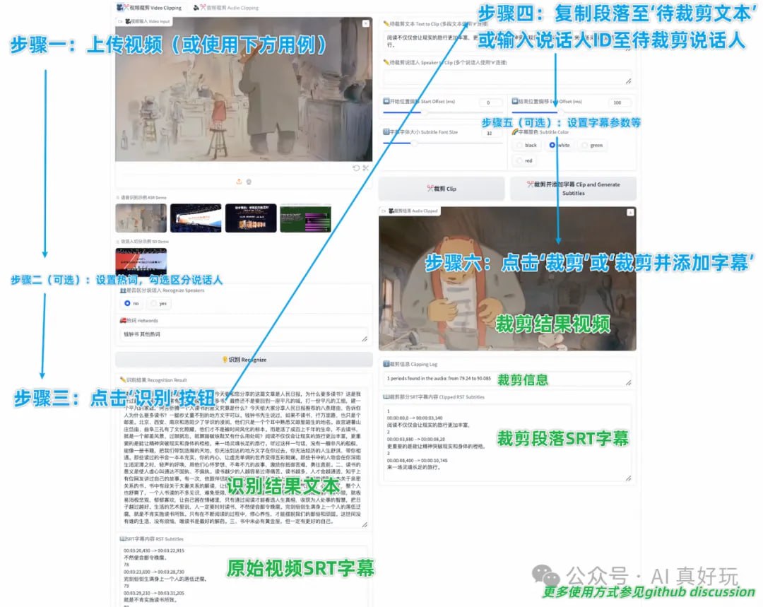 FunClip 2024-05-09 🆔 项目名称:FunClip ⭐️ 项目功能:自动化视频剪辑 📁 项目简介:一款完全开源、本地部署的自动化视频剪辑工具,通过调用阿里巴巴通义实验室开源的 FunASR Paraformer 系列模型进行视频的语音识别,随后用户可以自由选择识别结果中的文本片段或说话人,点击裁剪按钮即可获取对应片段的视频。 🌐 项目地址:点击打开 🌐 试用链接:点击使用