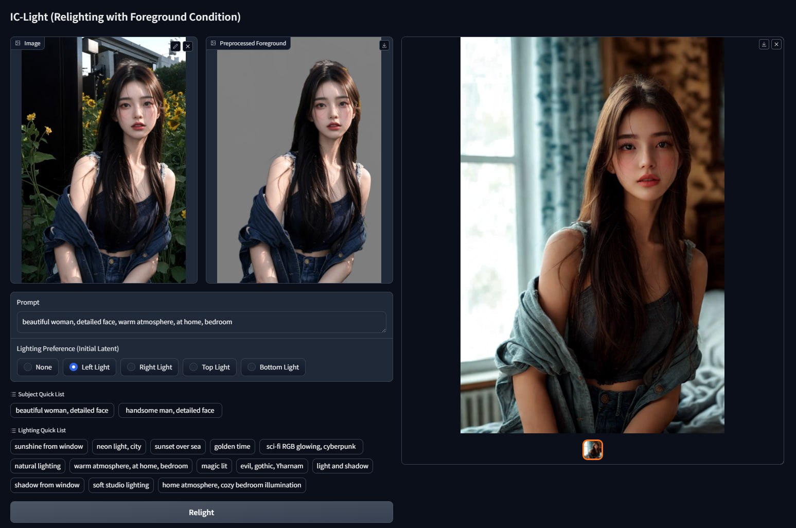 IC-Light 2024-06-12 🆔 项目名称:IC-Light ⭐️ 项目功能:AI打光 📁 项目简介:一款AI智能打光工具,通过提供文本条件和背景条件下的重照明模型,使用户能够对图像进行精细的照明调整,从而实现背景替换或改善图像的整体视觉效果。 🌐 项目地址:点击打开 🌐 在线试用:点击使用